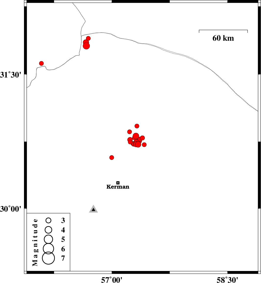 | 2018/01/28 | 05:59:54.8 | 09:29:54.8 | 30.715 | 57.42 | 14 | ML2.5 | Kerman Province, 58 km North-East of Kerman | ||