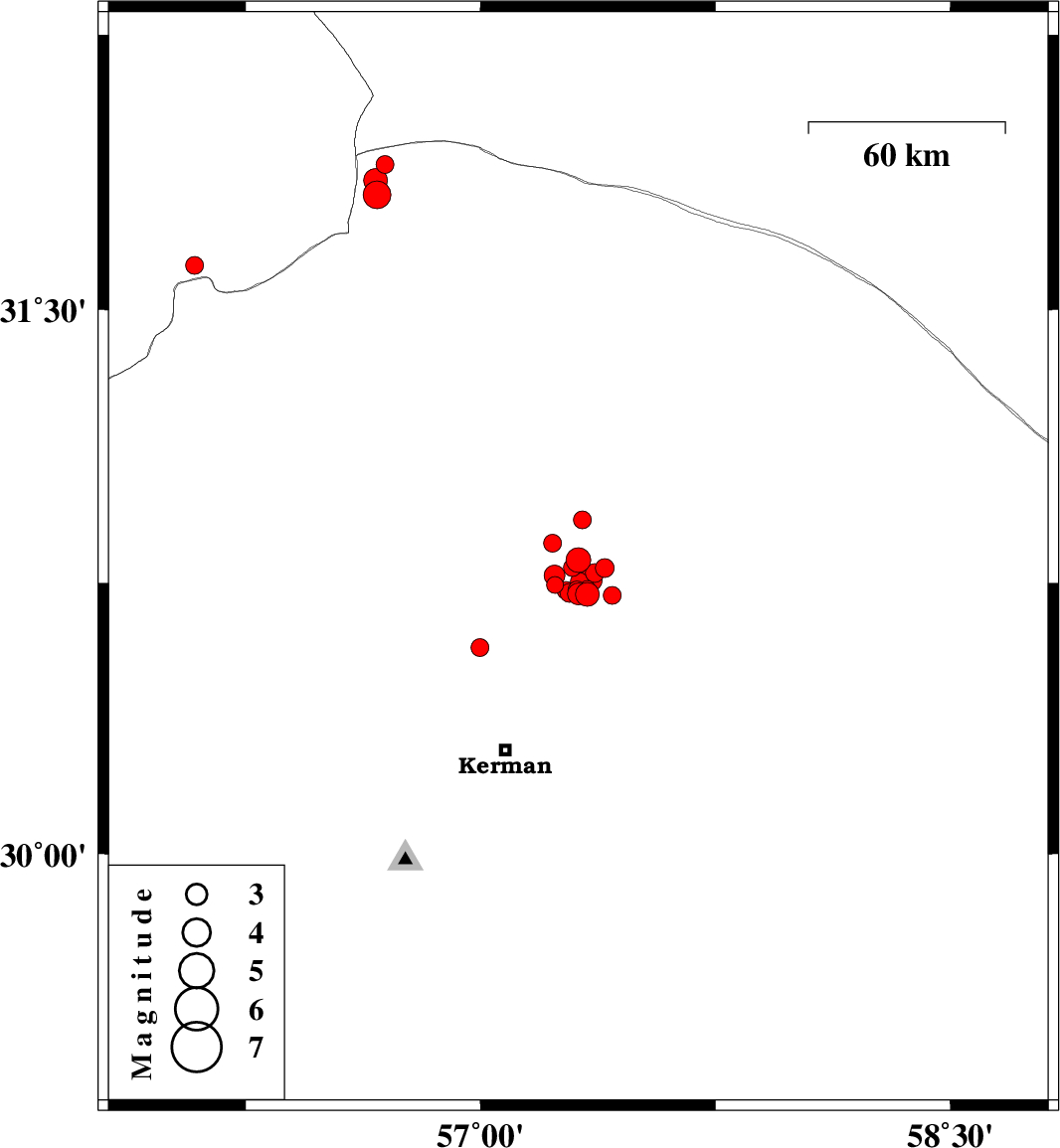 | 2018/01/28 | 15:55:45.1 | 19:25:45.1 | 30.722 | 57.284 | 14 | ML2.7 | Kerman Province, 52 km North-East of Kerman | ||