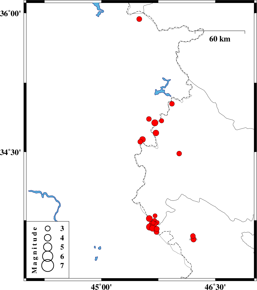 | 2018/01/31 | 04:04:05.4 | 07:34:05.4 | 33.686 | 45.676 | 16 | ML3.2 | Kermanshah Province, 55 km South-West of Gilan-E-Gharb | ||