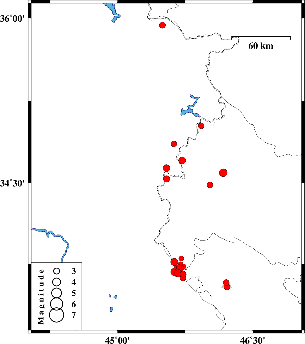 | 2018/01/25 | 03:19:14.4 | 06:49:14.4 | 34.593 | 46.173 | 15 | ML4 | Kermanshah Province, 30 km North-East of Sar-e pol-e zahab |
