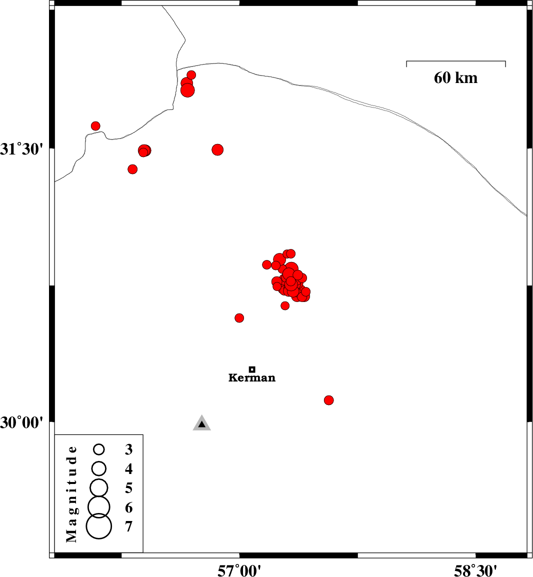 | 2018/01/21 | 14:34:19.4 | 18:04:19.4 | 30.8 | 57.322 | 16 | ML2.6 | Kerman Province, 62 km North-East of Kerman | ||