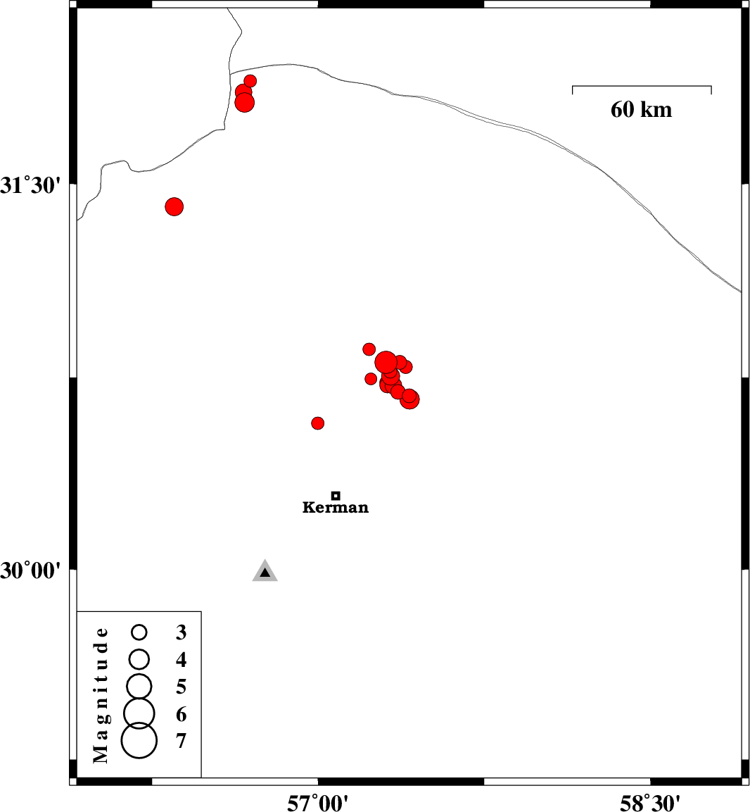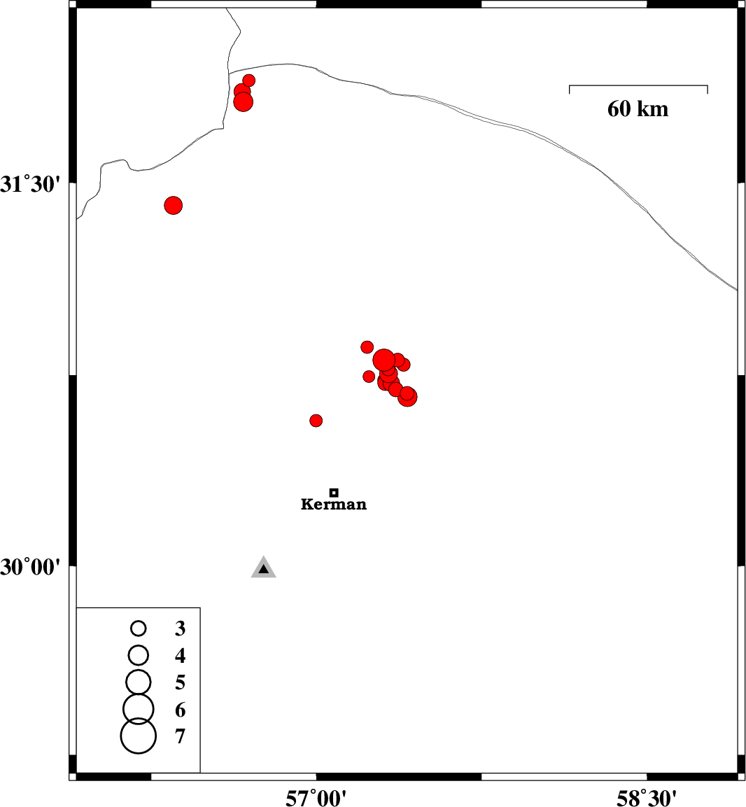 | 2018/02/01 | 15:19:24.2 | 18:49:24.2 | 30.571 | 56.998 | 7 | ML2.5 | Kerman Province, 32 km North of Kerman | ||