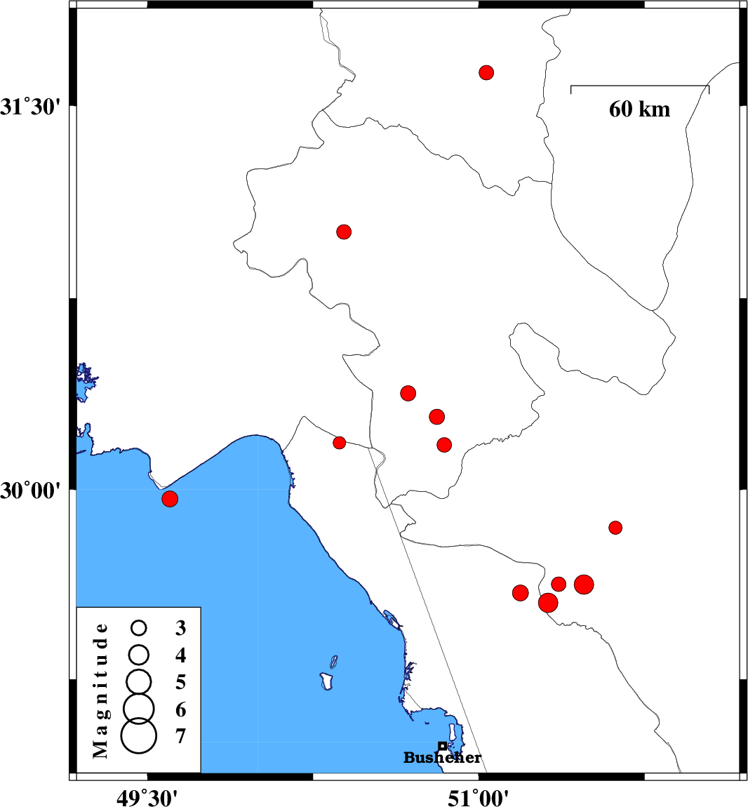 2018/01/22 | 13:37:12.5 | 17:07:12.5 | 29.591 | 51.188 | 15 | ML:3.3 | Bushehr Province, 37 km North of Borazjan | ||