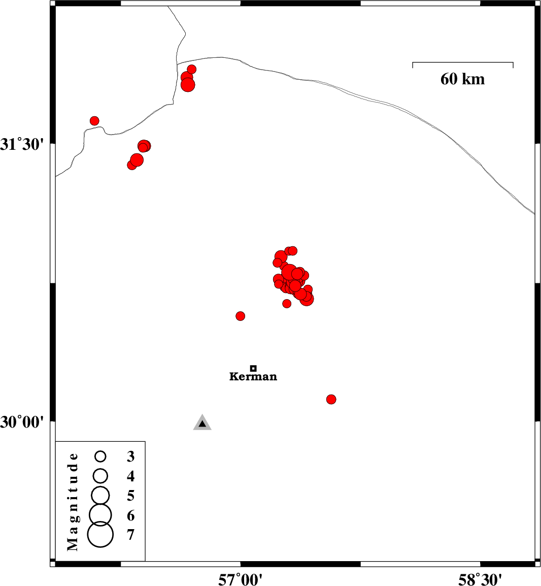 | 2018/01/28 | 19:05:49.6 | 22:35:49.6 | 30.77 | 57.236 | 14 | ML3 | Kerman Province, 56 km North-East of Kerman | ||