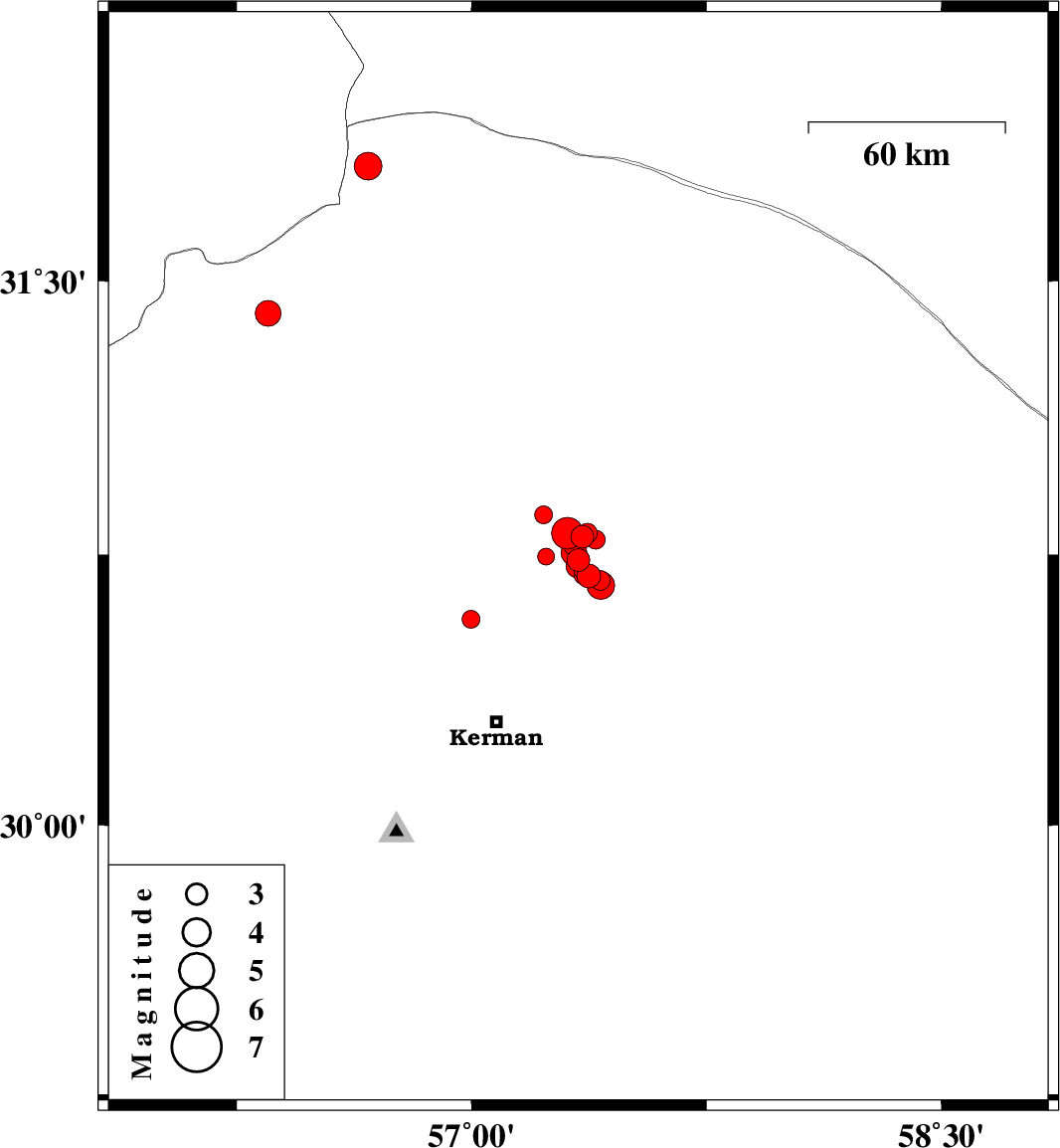 | 2018/02/01 | 15:19:24.2 | 18:49:24.2 | 30.571 | 56.998 | 7 | ML2.5 | Kerman Province, 32 km North of Kerman | ||