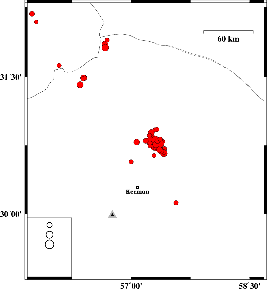 | 2018/01/28 | 05:59:54.8 | 09:29:54.8 | 30.715 | 57.42 | 14 | ML2.5 | Kerman Province, 58 km North-East of Kerman | ||