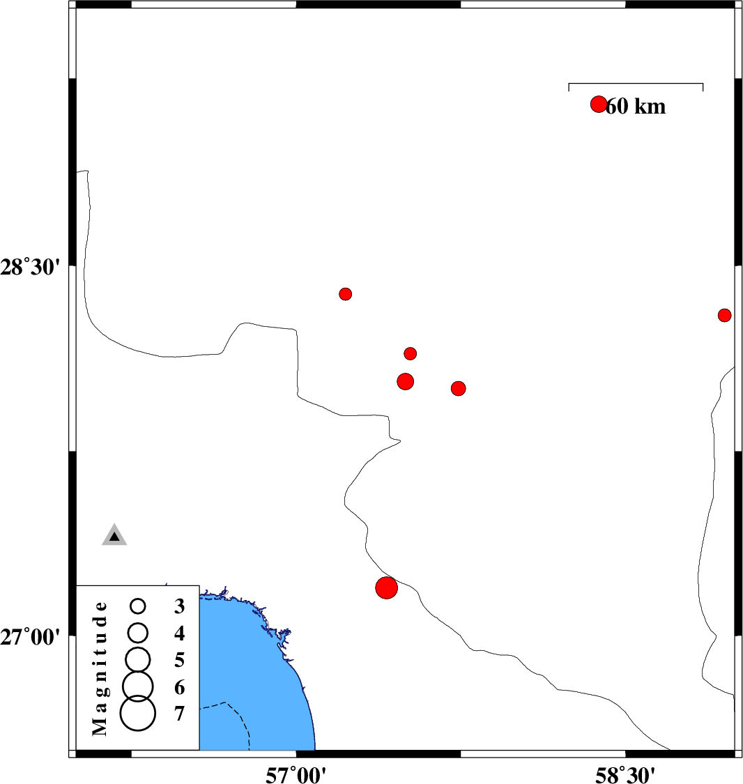 | 2018/01/21 | 20:06:19.7 | 23:36:19.7 | 28.385 | 57.224 | 14 | ML2.5 | Kerman Province, 59 km South-West of Jiroft |