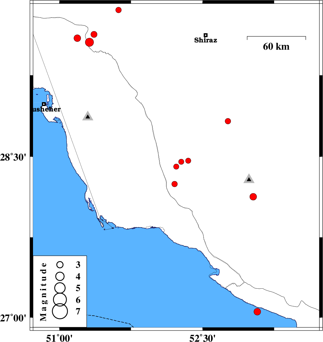 | 2018/01/22 | 13:37:12.5 | 17:07:12.5 | 29.591 | 51.188 | 15 | ML3.3 | Bushehr Province, 37 km North of Borazjan | ||
