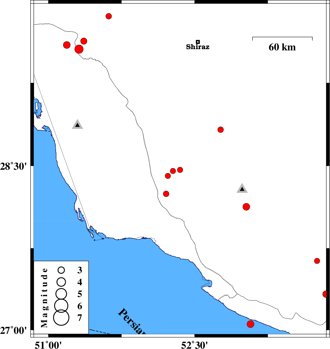 | 2018/01/22 | 13:37:12.5 | 17:07:12.5 | 29.591 | 51.188 | 15 | ML3.3 | Bushehr Province, 37 km North of Borazjan | ||