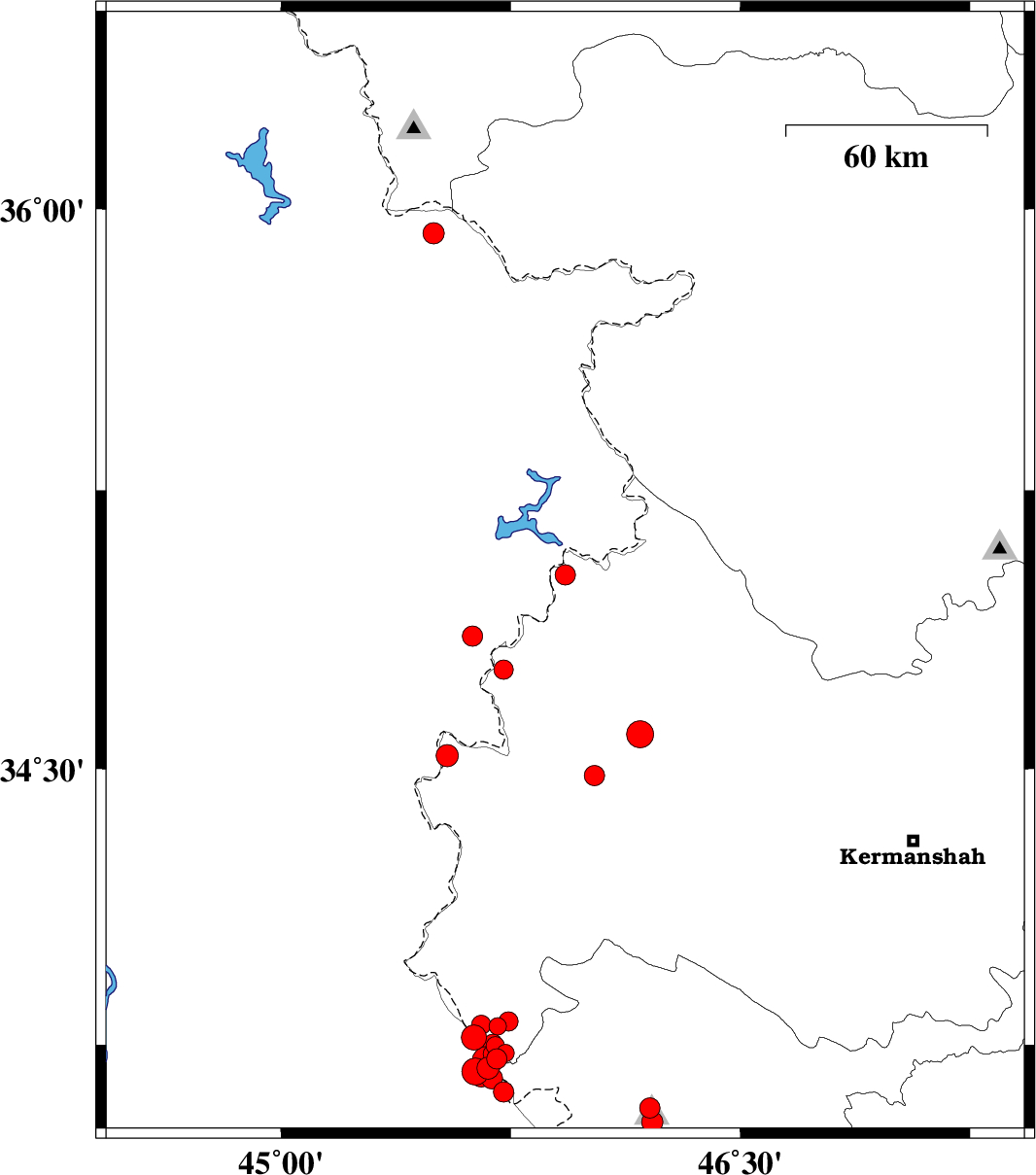 | 2018/01/25 | 03:19:14.4 | 06:49:14.4 | 34.593 | 46.173 | 15 | ML4 | Kermanshah Province, 30 km North-East of Sar-e pol-e zahab | ||