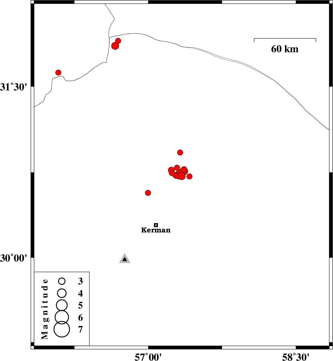 | 2018/01/28 | 19:05:49.6 | 22:35:49.6 | 30.77 | 57.236 | 14 | ML3 | Kerman Province, 56 km North-East of Kerman | ||