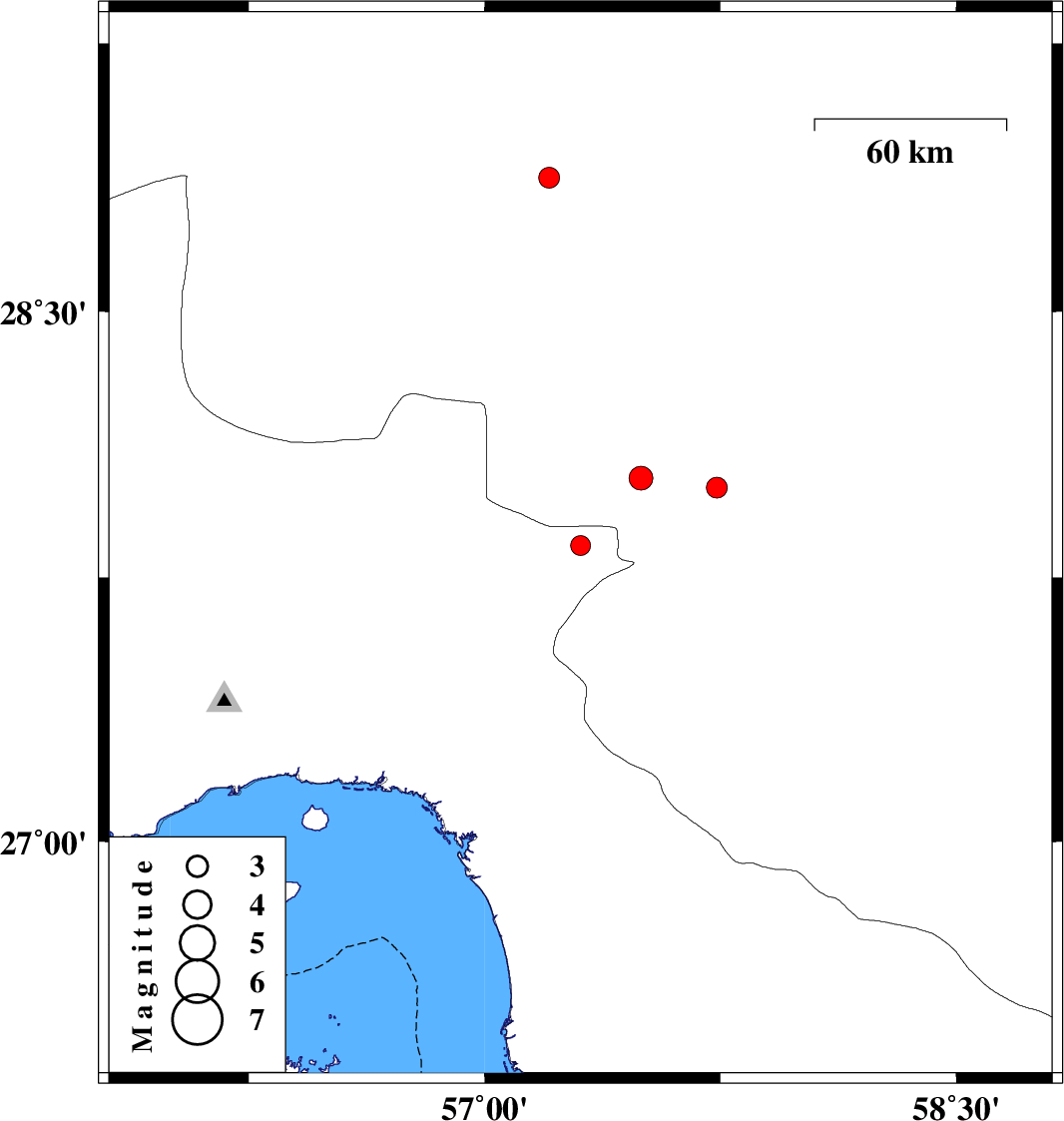 | 2018/02/08 | 16:20:55.4 | 19:50:55.4 | 28.004 | 57.738 | 18 | ML2.9 | Kerman Province, 7 km of Kahnuj |