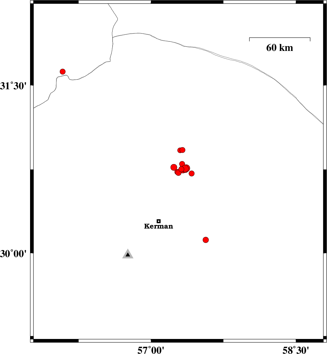 2018/01/28 | 05:59:54.8 | 09:29:54.8 | 30.715 | 57.42 | 14 | ML:2.5 | Kerman Province, 58 km North-East of Kerman | ||
