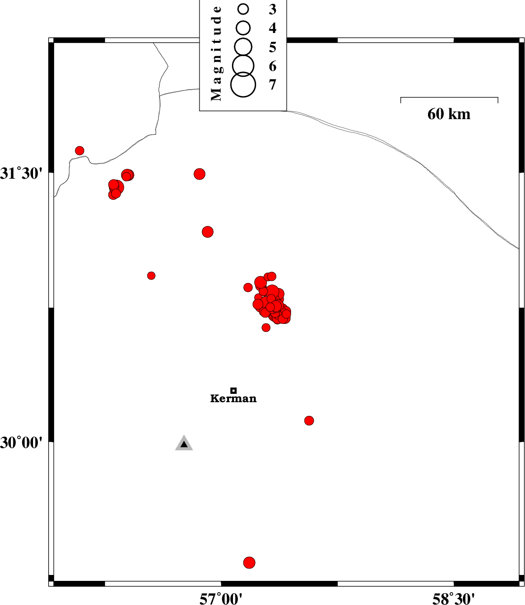 2018/01/01 | 05:44:55.1 | 09:14:55.1 | 30.789 | 57.352 | 14 | ML:2.8 | Kerman Province, 62 km North-East of Kerman | ||