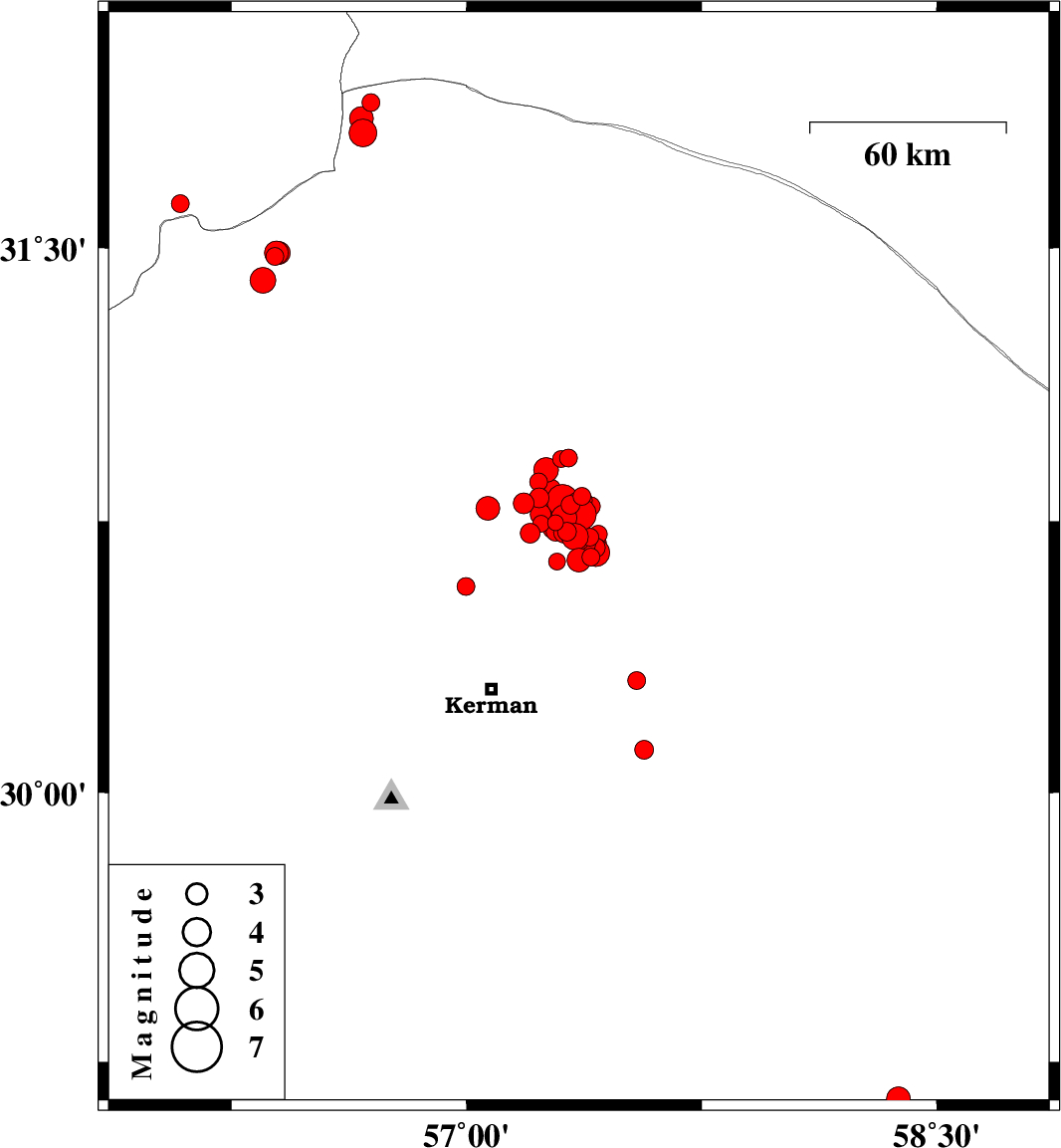 | 2018/01/21 | 14:34:19.4 | 18:04:19.4 | 30.8 | 57.322 | 16 | ML2.6 | Kerman Province, 62 km North-East of Kerman | ||