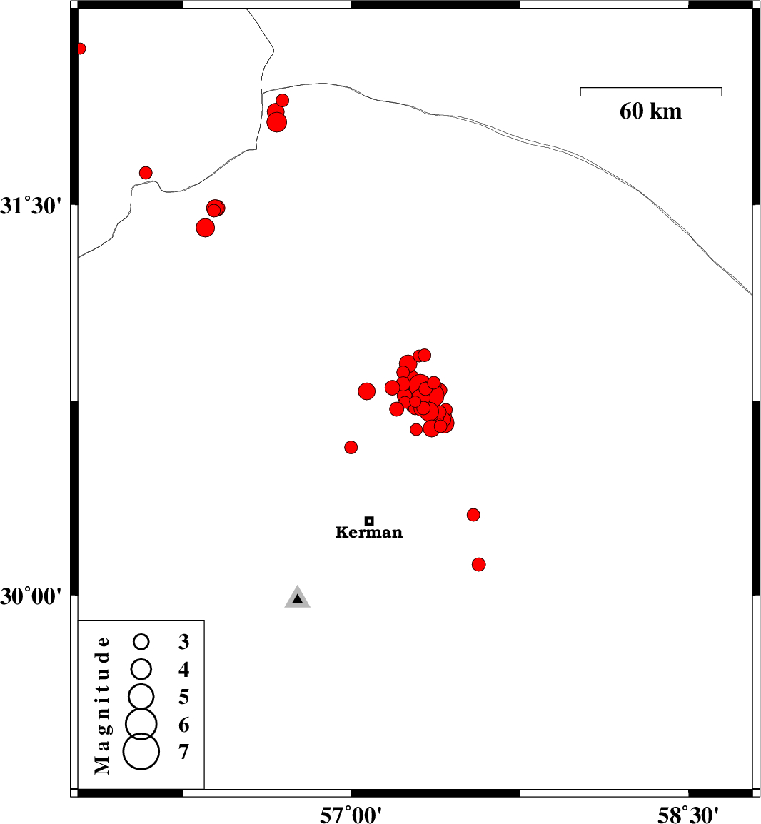 | 2018/01/28 | 05:59:54.8 | 09:29:54.8 | 30.715 | 57.42 | 14 | ML2.5 | Kerman Province, 58 km North-East of Kerman | ||