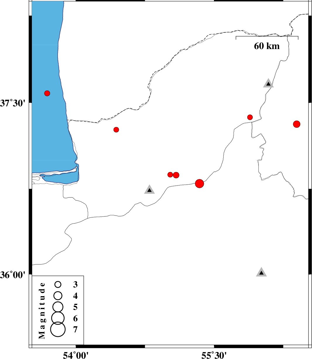 | 2018/02/17 | 12:02:29.2 | 15:32:29.2 | 36.87 | 55.087 | 16 | ML2.9 | Golestan Province, 17 km South of Ramian | ||