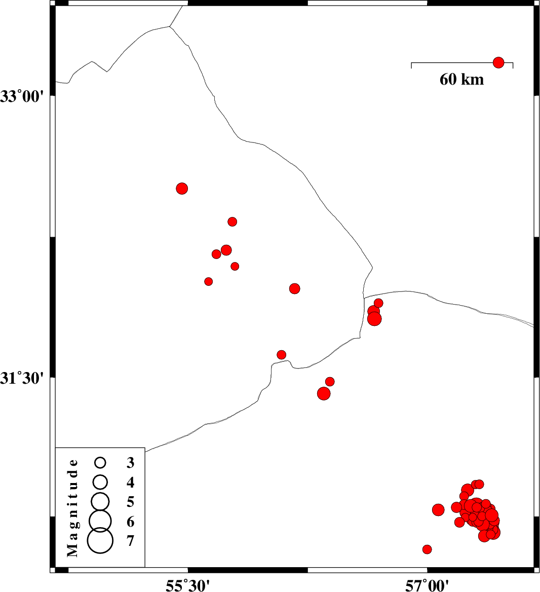 | 2018/01/21 | 00:30:01.7 | 04:00:01.7 | 30.752 | 57.33 | 14 | ML3.5 | Kerman Province, 57 km North-East of Kerman | ||