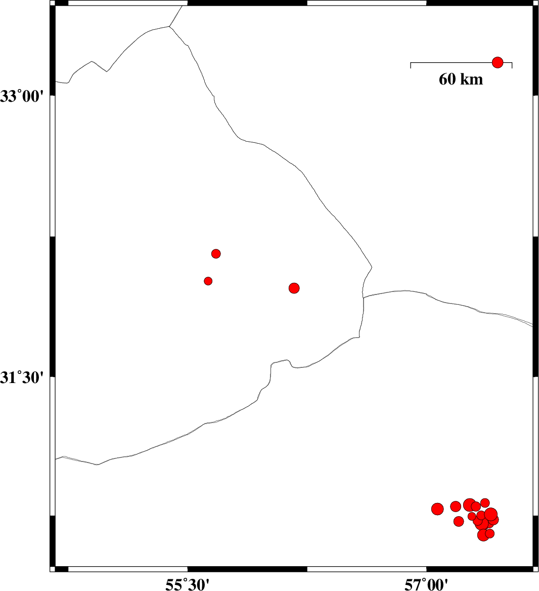 | 2018/02/16 | 13:05:15.7 | 16:35:15.7 | 30.807 | 57.272 | 15 | ML3.6 | Kerman Province, 67 km -East of Zarand | ||