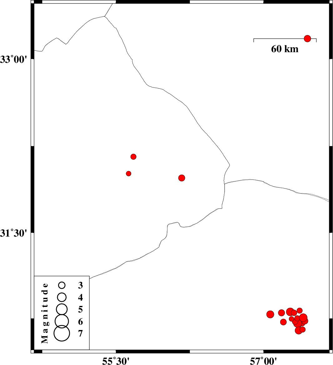 | 2018/02/11 | 10:25:29.7 | 13:55:29.7 | 30.703 | 57.355 | 17 | ML3.4 | Kerman Province, 53 km North-East of Kerman |