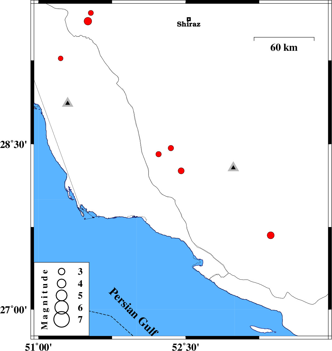 2018/02/17 | 11:15:18.1 | 14:45:18.1 | 27.675 | 53.367 | 6 | ML:3.2 | Fars Province, 43 km North-East of Lamerd | ||