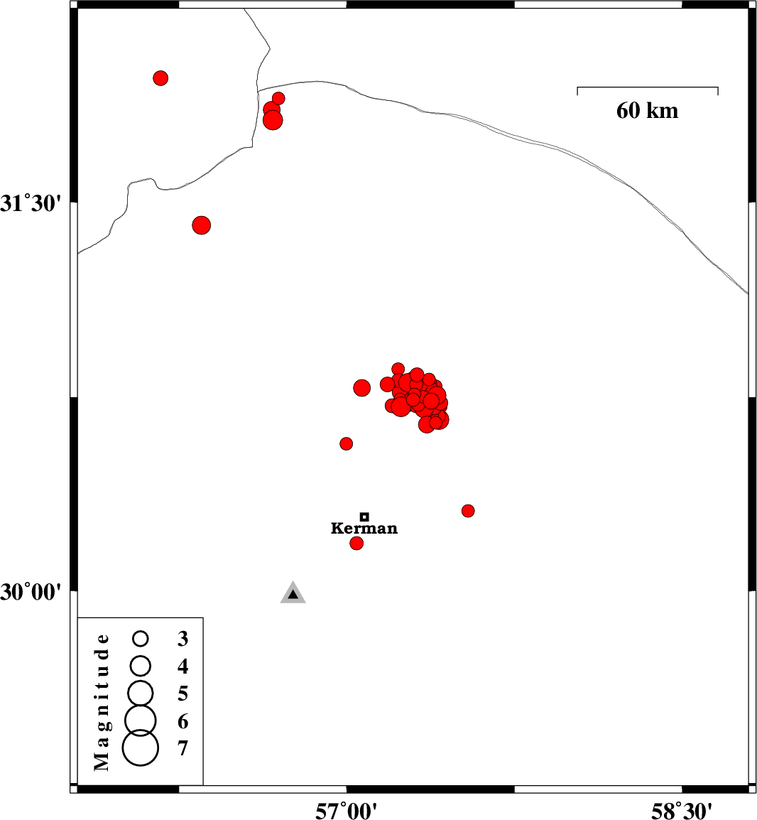 | 2018/01/28 | 05:59:54.8 | 09:29:54.8 | 30.715 | 57.42 | 14 | ML2.5 | Kerman Province, 58 km North-East of Kerman |