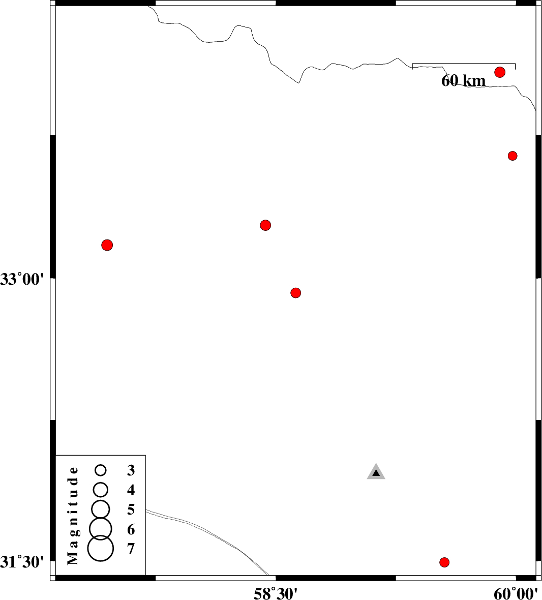 2018/02/13 | 03:30:33.1 | 07:00:33.1 | 33.174 | 57.446 | 14 | ML:3.1 | Yazd Province, 68 km South-East of Tabas | ||