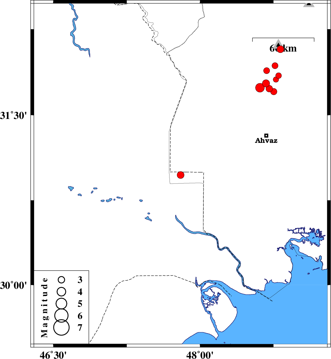 | 2018/02/01 | 02:46:10.1 | 06:16:10.1 | 31.705 | 48.754 | 15 | ML2.9 | Khoozestan Province, 39 km South of Shushtar |