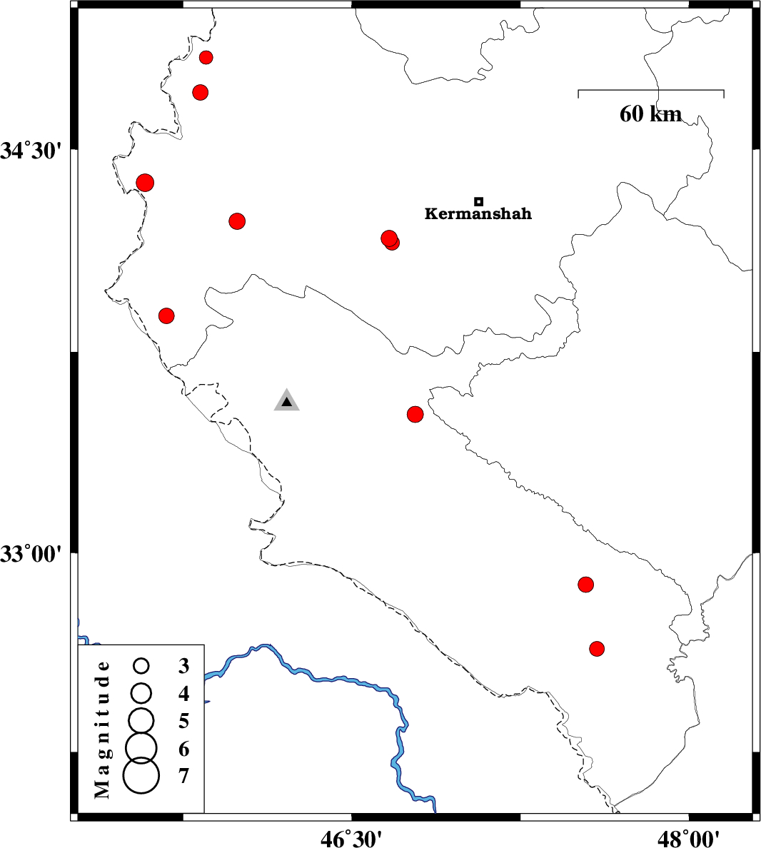 2018/03/03 | 21:56:07.0 | 01:26:07.0 | 34.171 | 46.666 | 14 | ML:3.3 | Kermanshah Province, 8 km of Eslam Abad-E-Gharb | ||