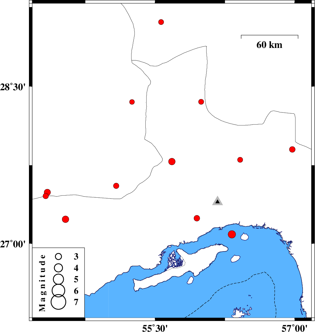 | 2018/03/04 | 03:56:03.2 | 07:26:03.2 | 27.786 | 55.68 | 12 | ML3.2 | Hormozgan Province, 62 km South-West of Hajiabad | ||