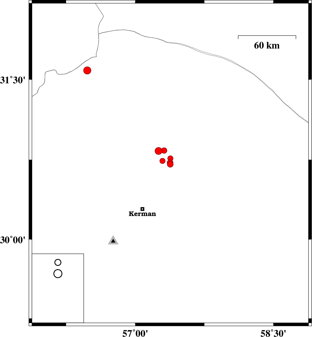 | 2018/03/04 | 11:35:27.1 | 15:05:27.1 | 30.708 | 57.38 | 14 | ML3 | Kerman Province, 55 km North-East of Kerman | ||