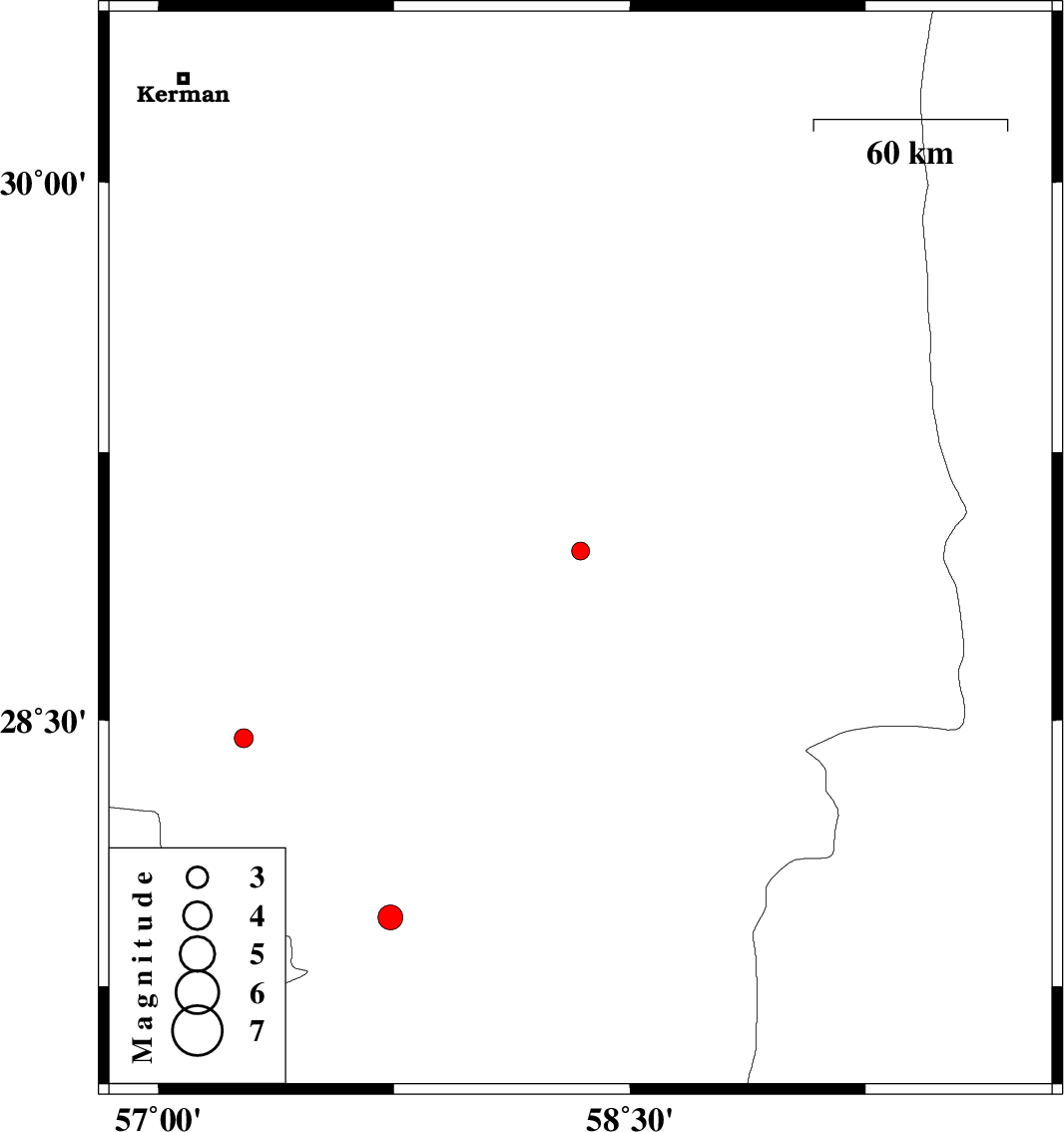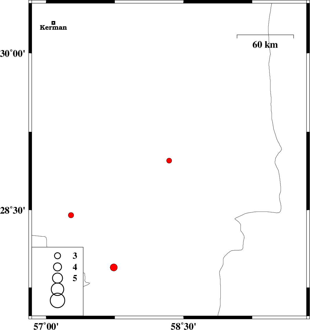| 2018/02/26 | 01:55:09.5 | 05:25:09.5 | 27.945 | 57.738 | 14 | ML3.5 | Kerman Province, 4 km of Kahnuj |