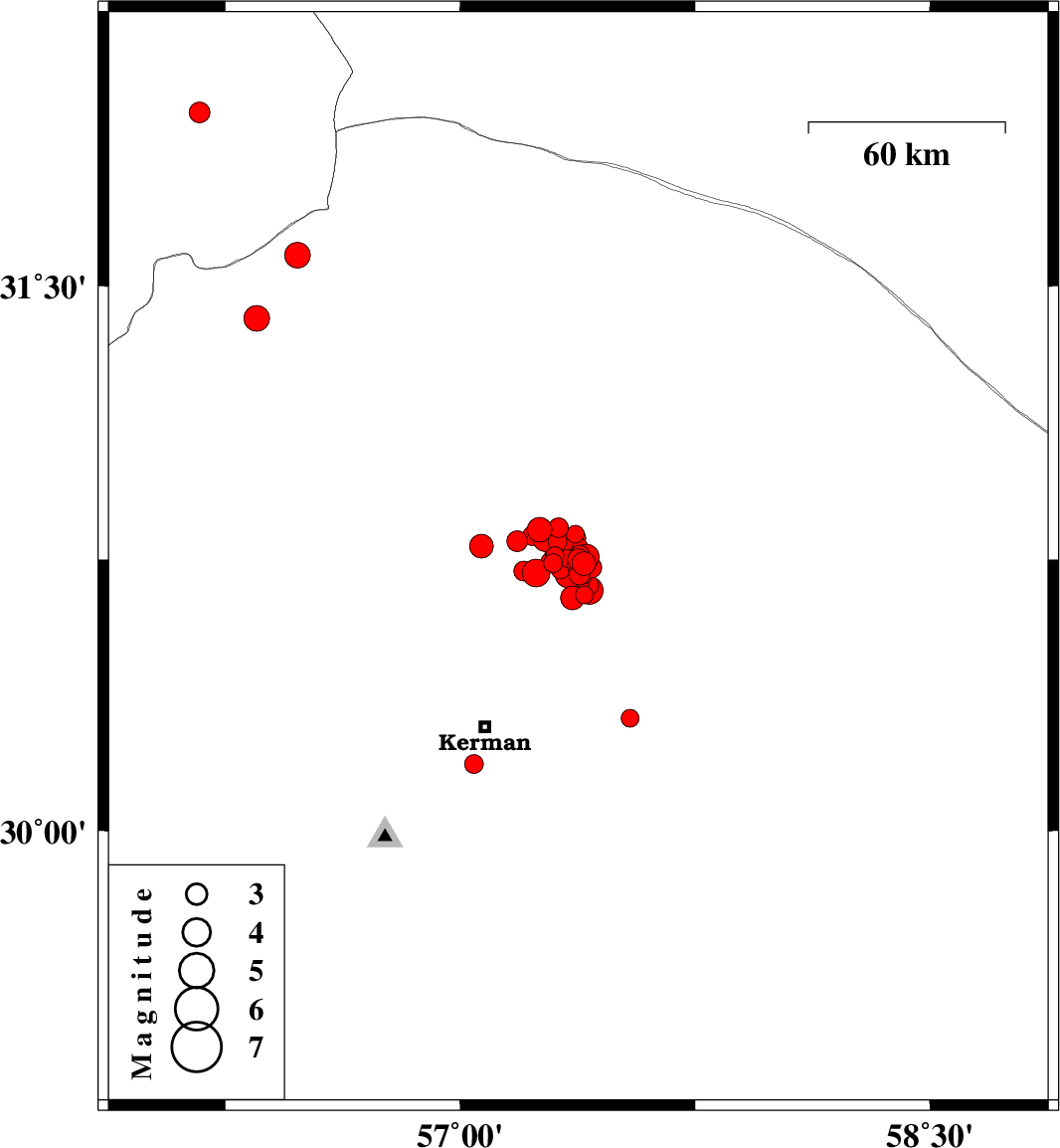 | 2018/03/04 | 11:35:27.1 | 15:05:27.1 | 30.708 | 57.38 | 14 | ML3 | Kerman Province, 55 km North-East of Kerman | ||