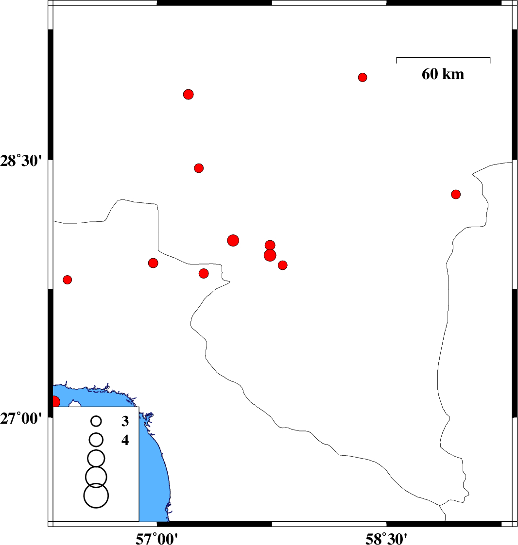 | 2018/02/13 | 11:37:42.7 | 15:07:42.7 | 27.84 | 57.305 | 14 | ML2.8 | Hormozgan Province, 46 km North of Dehbarez | ||