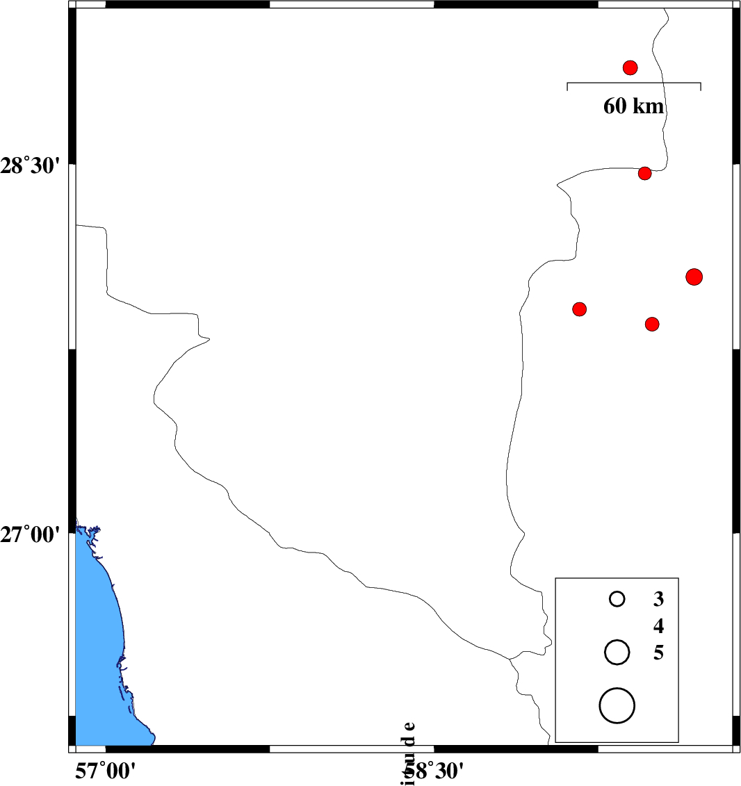2018/03/06 | 00:04:47.5 | 03:34:47.5 | 27.628 | 58.364 | 15 | ML2.8 | Kerman Province, 75 km South-East of Kahnuj | ||