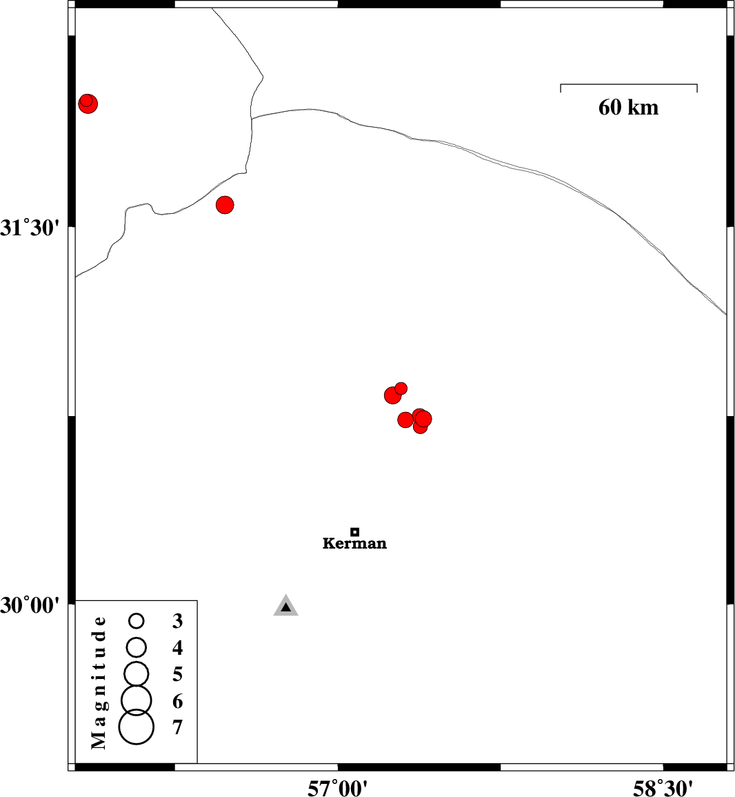 | 2018/03/04 | 11:35:27.1 | 15:05:27.1 | 30.708 | 57.38 | 14 | ML3 | Kerman Province, 55 km North-East of Kerman | ||