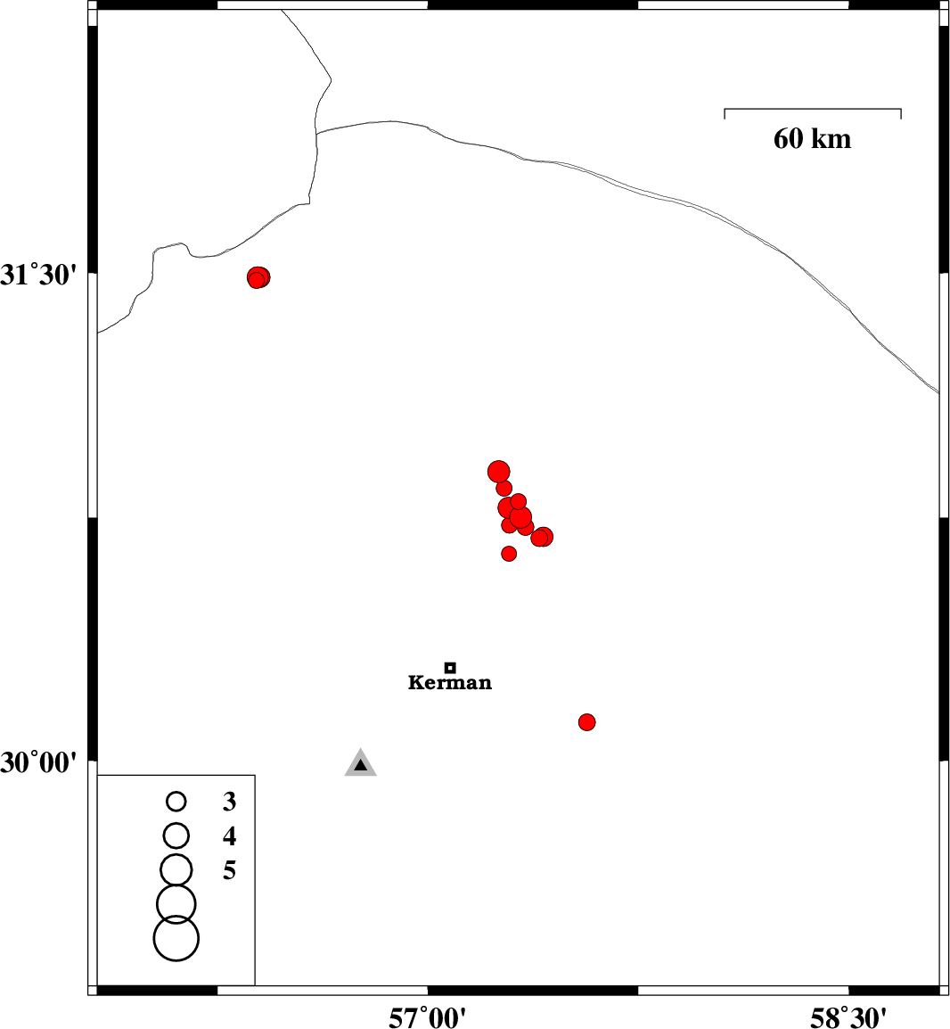 | 2018/01/21 | 14:34:19.4 | 18:04:19.4 | 30.8 | 57.322 | 16 | ML2.6 | Kerman Province, 62 km North-East of Kerman | ||