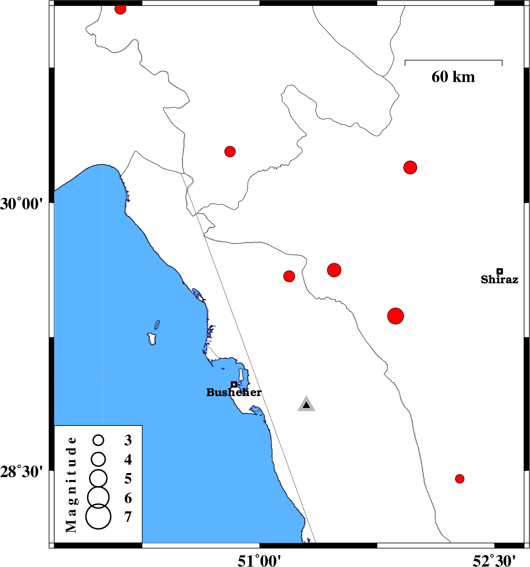 | 2018/01/22 | 13:37:12.5 | 17:07:12.5 | 29.591 | 51.188 | 15 | ML3.3 | Bushehr Province, 37 km North of Borazjan | ||