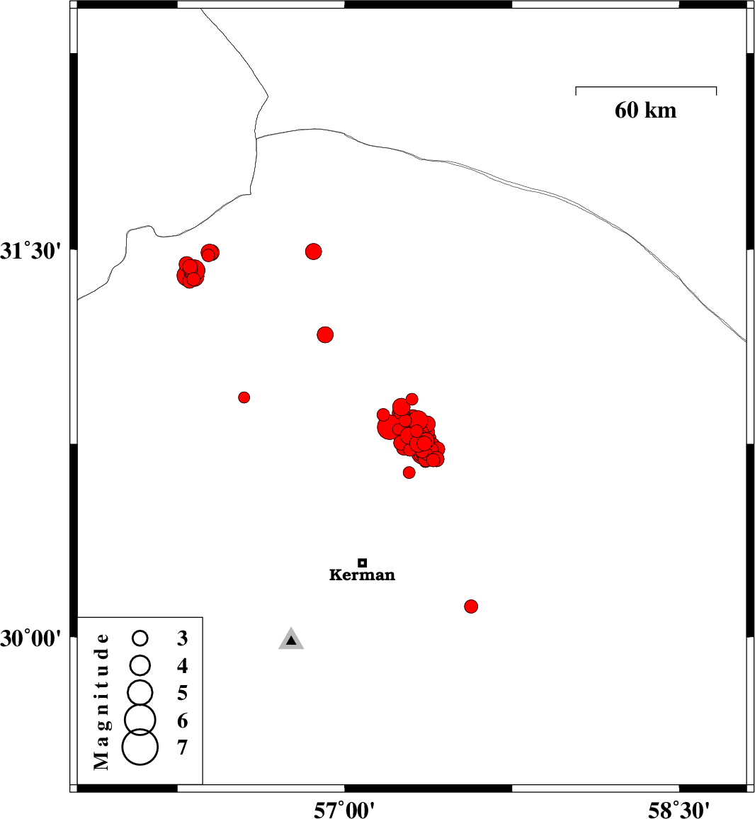 | 2017/12/27 | 10:13:09.7 | 13:43:09.7 | 30.751 | 57.357 | 14 | ML2.9 | Kerman Province, 58 km North-East of Kerman | ||