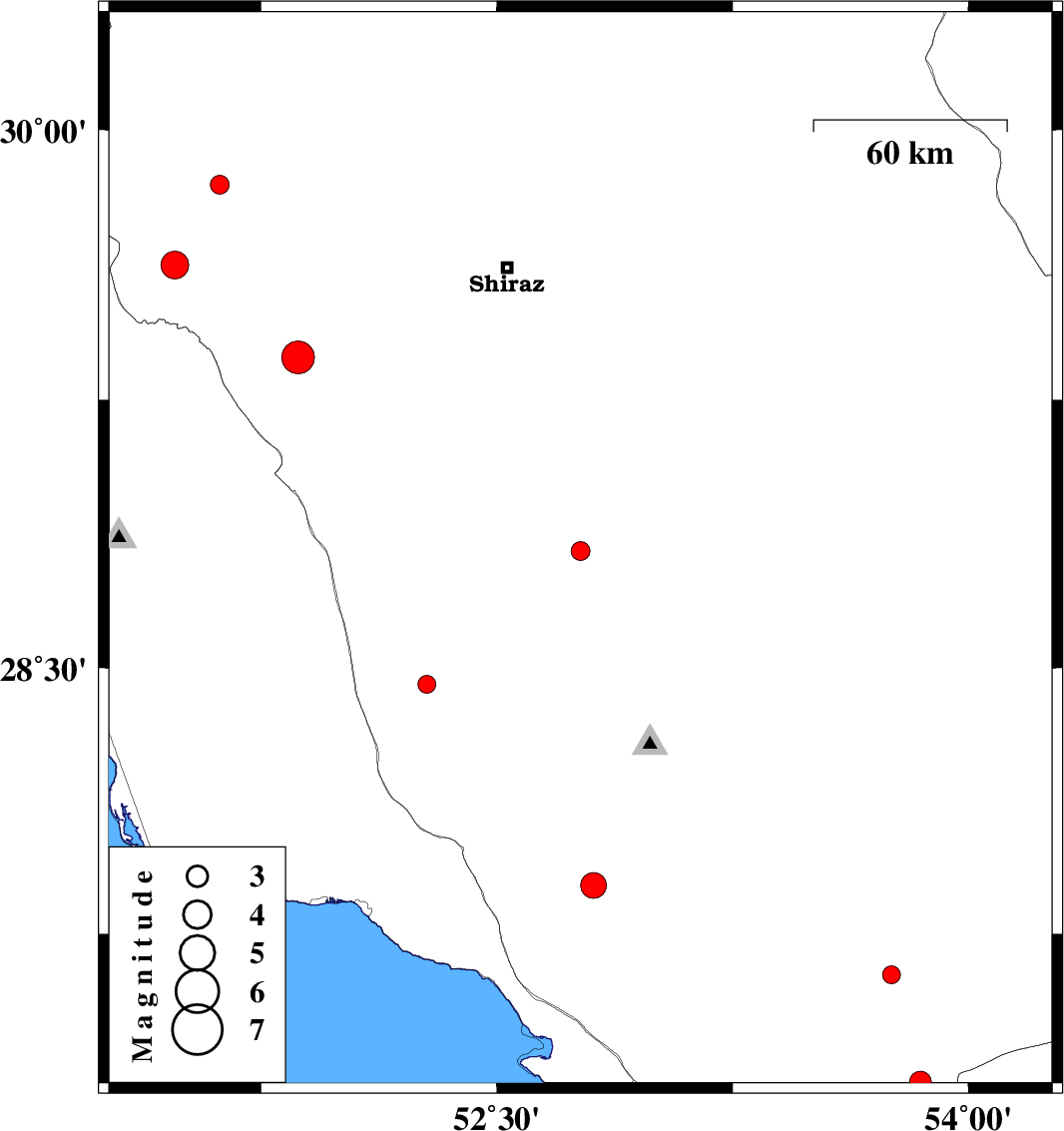 | 2017/12/30 | 20:53:23.4 | 00:23:23.4 | 29.369 | 51.868 | 15 | ML4.6 | Fars Province, 35 km South-East of Kazerun |