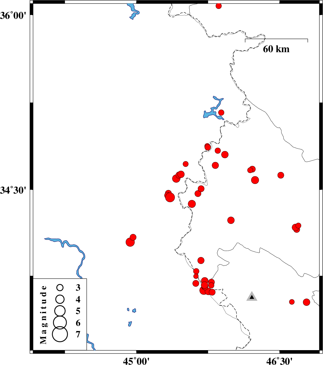 | 2018/03/11 | 09:48:57.7 | 13:18:57.7 | 34.596 | 45.417 | 15 | ML3.6 | Iraq, 18 km -West of Qasr-E-Shirin | ||