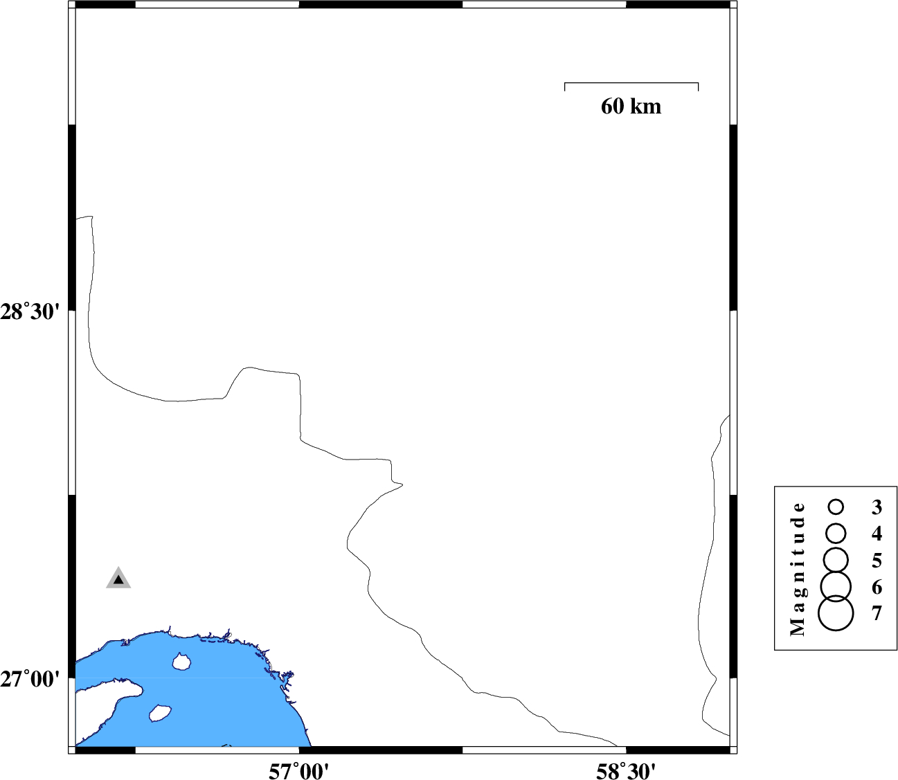 | 2018/03/06 | 00:04:47.5 | 03:34:47.5 | 27.628 | 58.364 | 15 | ML2.8 | Kerman Province, 75 km South-East of Kahnuj | ||
