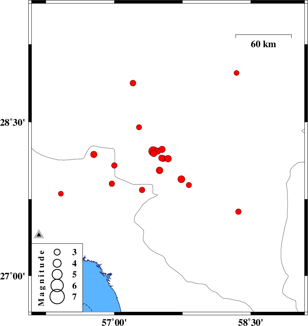 | 2018/03/06 | 00:04:47.5 | 03:34:47.5 | 27.628 | 58.364 | 15 | ML2.8 | Kerman Province, 75 km South-East of Kahnuj | ||