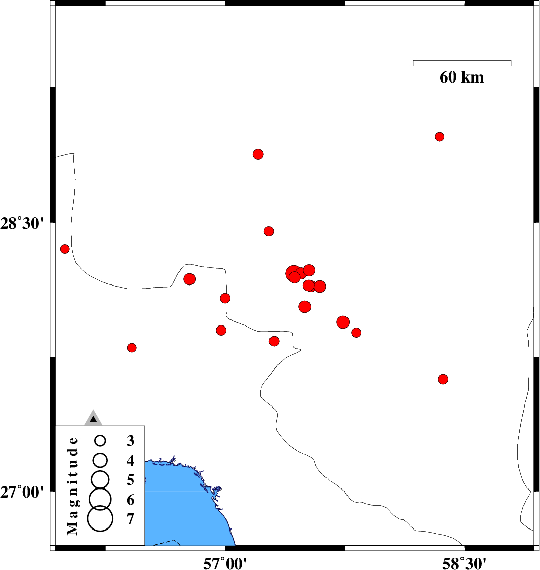 | 2018/03/06 | 00:04:47.5 | 03:34:47.5 | 27.628 | 58.364 | 15 | ML2.8 | Kerman Province, 75 km South-East of Kahnuj | ||