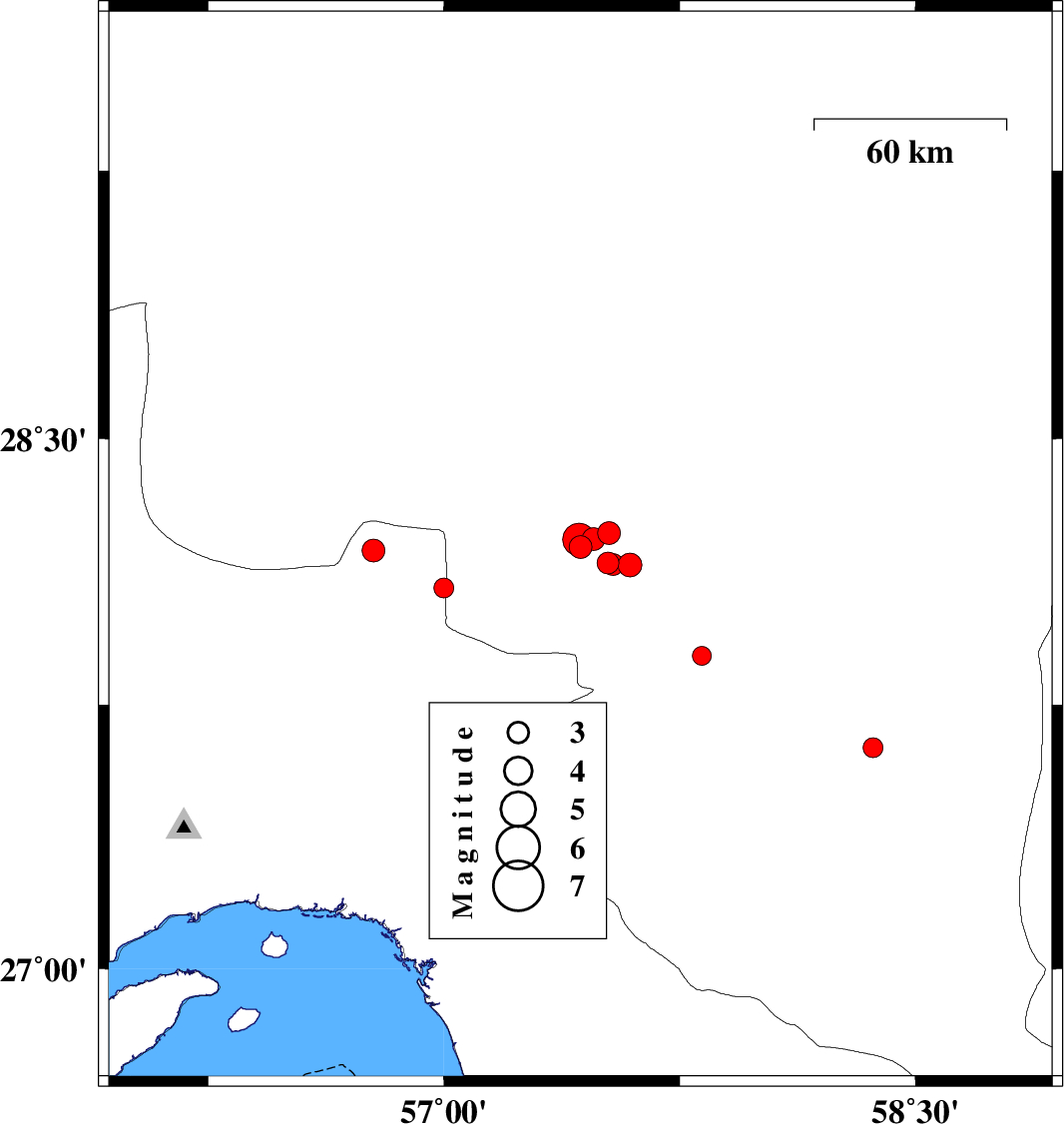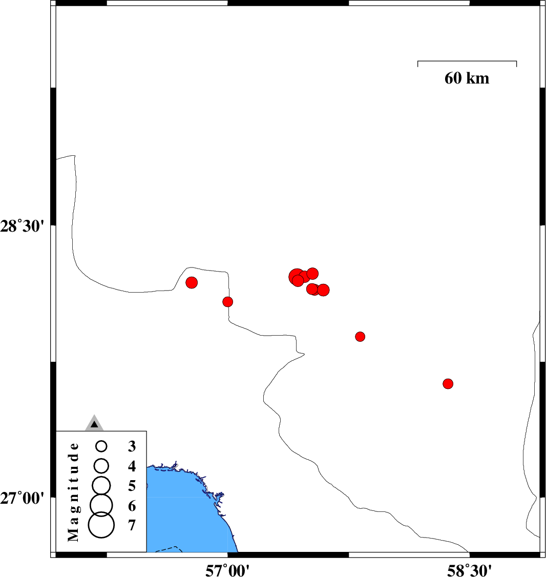 2018/03/12 07:35:33.7 11:05:33.7 28.21657.42918 ML4.6 Kerman Province, 39 km North-West of Kahnuj