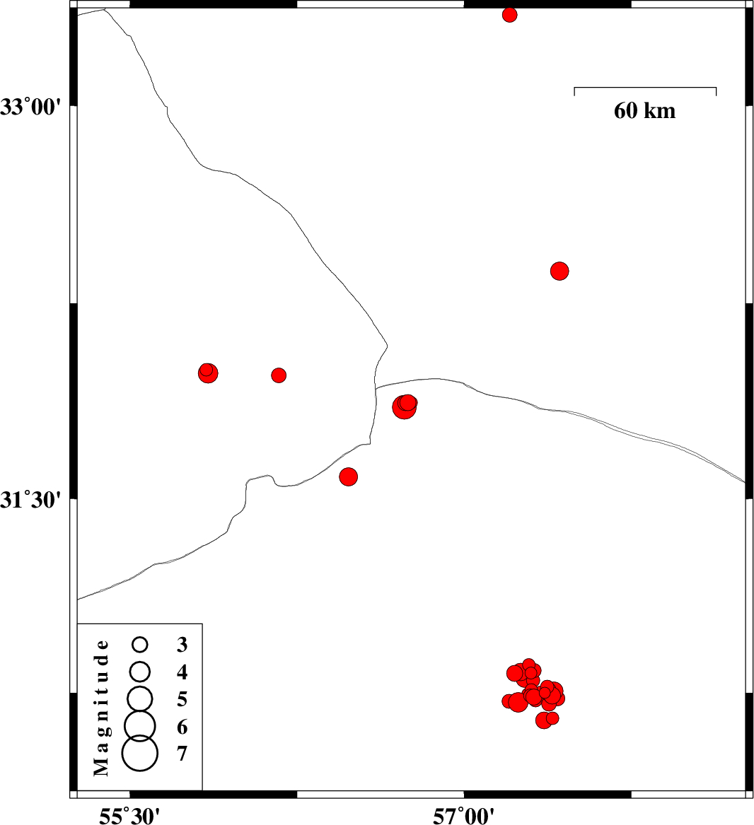 | 2018/03/04 | 11:35:27.1 | 15:05:27.1 | 30.708 | 57.38 | 14 | ML3 | Kerman Province, 55 km North-East of Kerman | ||