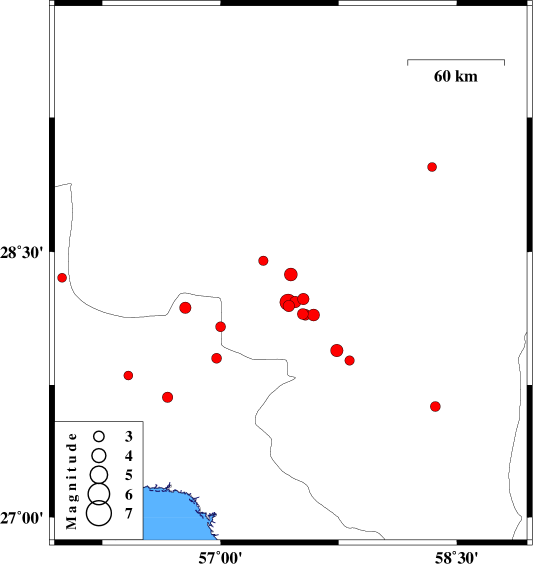 2018/03/06 | 00:04:47.5 | 03:34:47.5 | 27.628 | 58.364 | 15 | ML:2.8 | Kerman Province, 75 km South-East of Kahnuj | ||