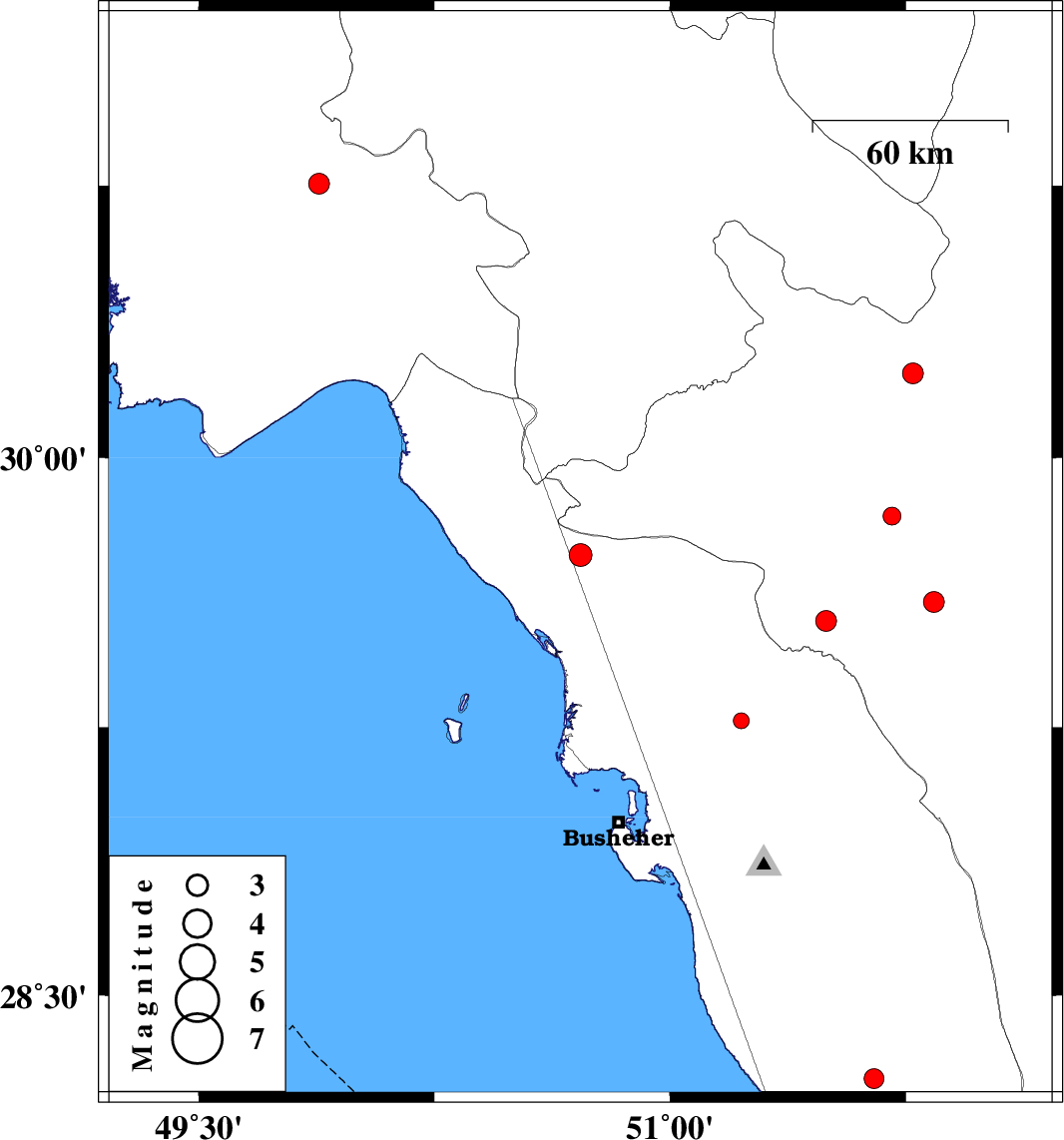 | 2018/02/15 | 01:38:36.2 | 05:08:36.2 | 29.268 | 51.226 | 14 | ML2.3 | Bushehr Province, 2 km of Borazjan |