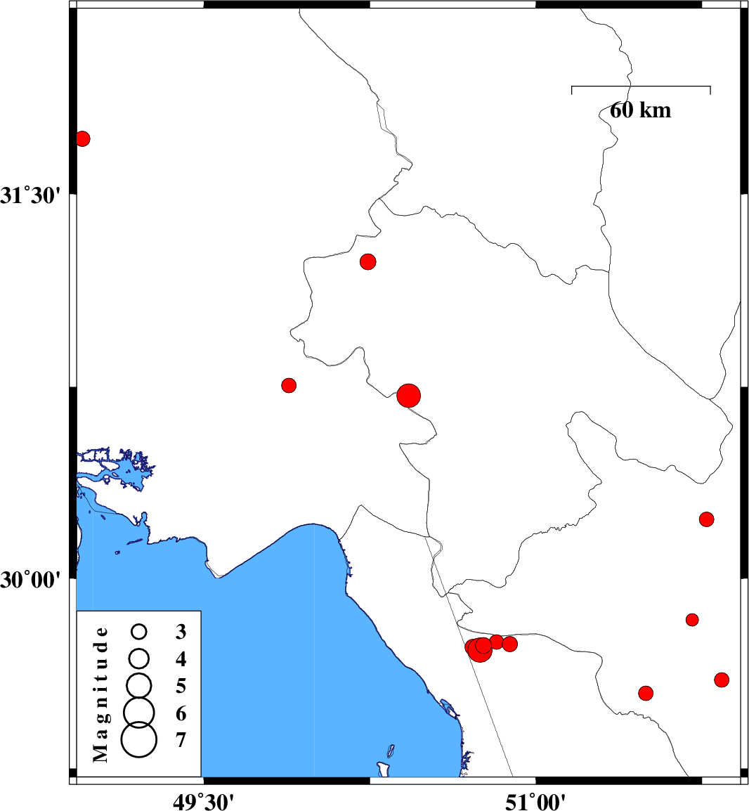 | 2018/03/19 | 06:17:10.8 | 09:47:10.8 | 29.741 | 50.882 | 14 | ML3.1 | Bushehr Province, 40 km North-East of Bandar-e genaveh | ||