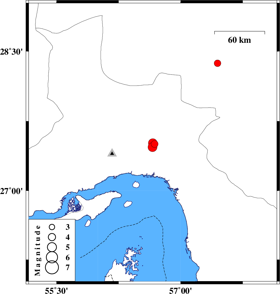 2018/03/21 12:33:09.9 16:03:09.9 27.51456.66315 ML4.8 Hormozgan Province, 58 km -West of Dehbarez